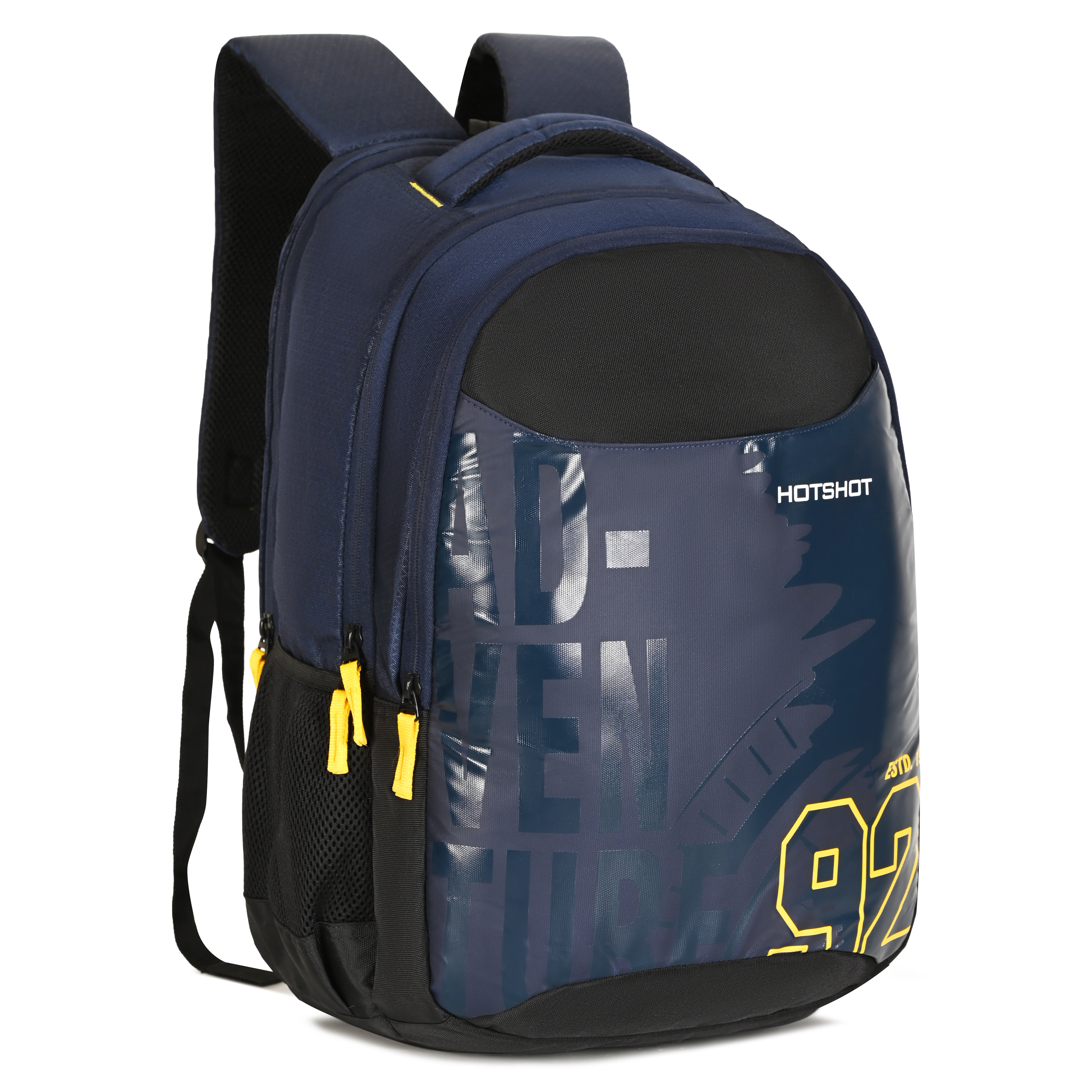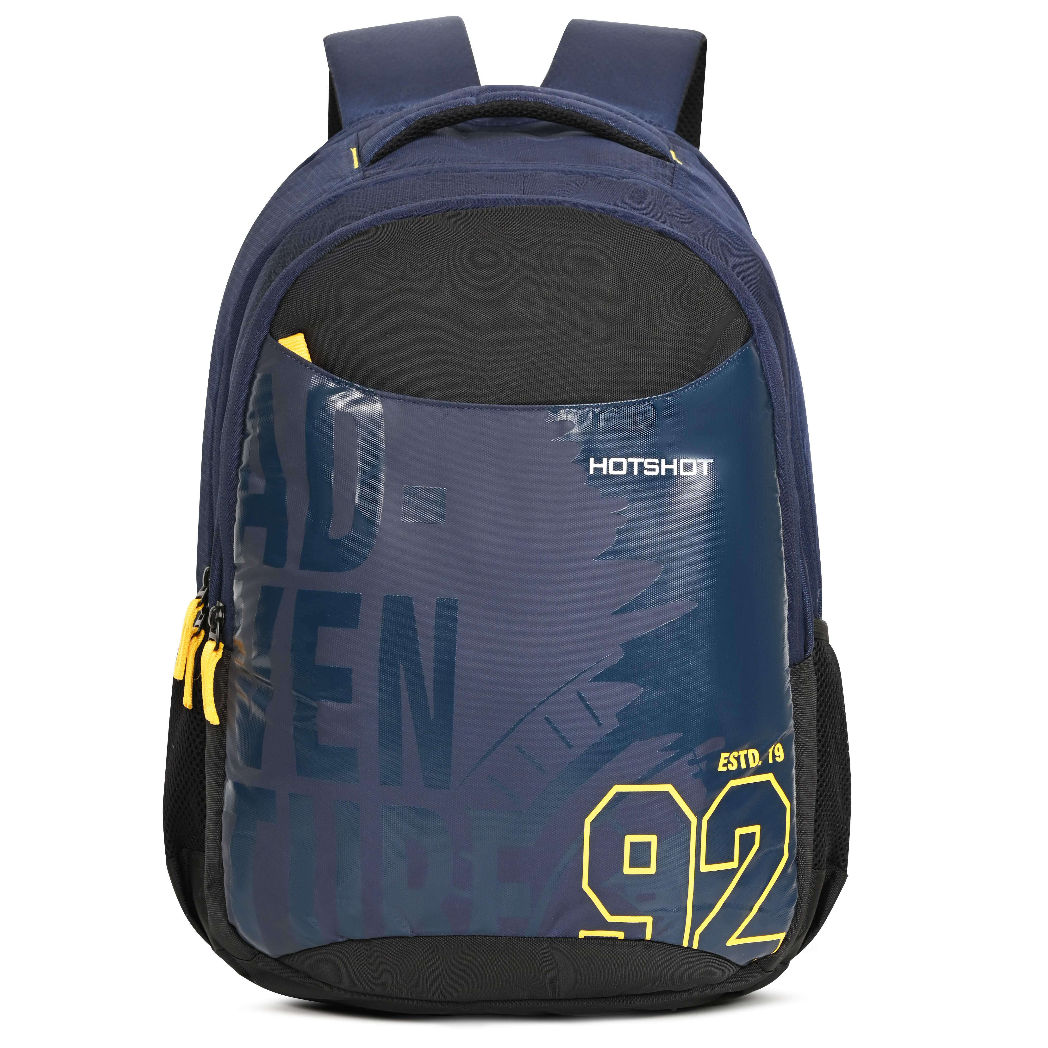 This Hotshot backpack with black accents and yellow detailing is designed to be both stylish and functional. It features a striking graphic design with the partially visible word “ADVENTURE” and the number “92” along with “ESTD. 19,” giving it a unique and adventurous look.Made from durable, water-resistant fabric, this backpack ensures your belongings stay protected. It includes a spacious main compartment, a padded sleeve that fits most laptops, and several smaller pockets for accessories like your phone, keys, and pens.The padded shoulder straps and cushioned back panel provide comfort, even when carrying heavy loads. The side pockets are perfect for holding water bottles, while the front pocket offers quick access to essential items. Sturdy zippers keep everything secure.