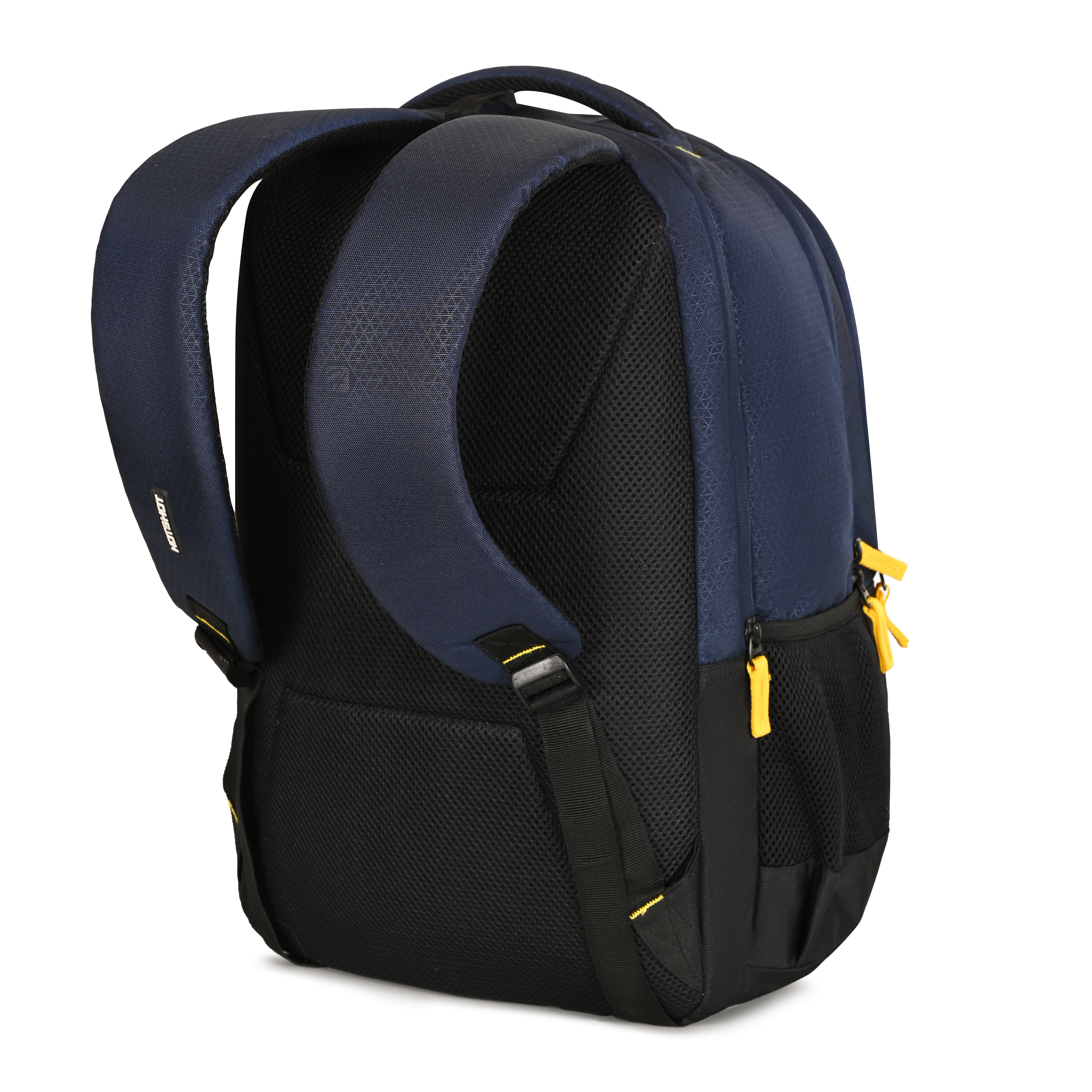 1. Design and Color: Navy blue with black accents and yellow detailing, featuring a graphic design with the words “ADVENTURE 92 ESTD. 19.”