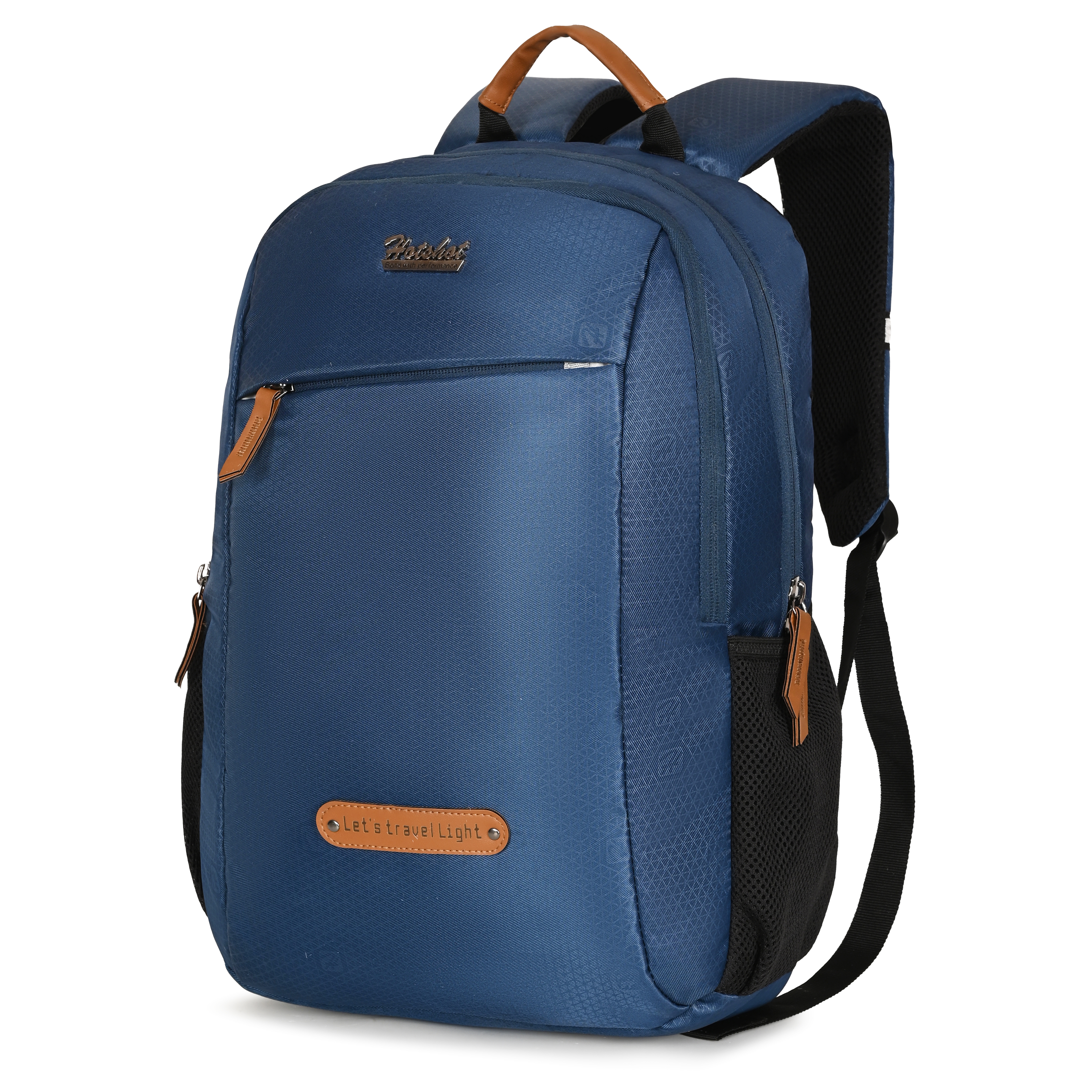 3. Branding: Features a tan leather patch with the inspirational motto “Let’s travel Light” and a silver metallic logo reading “Hotshot”.
