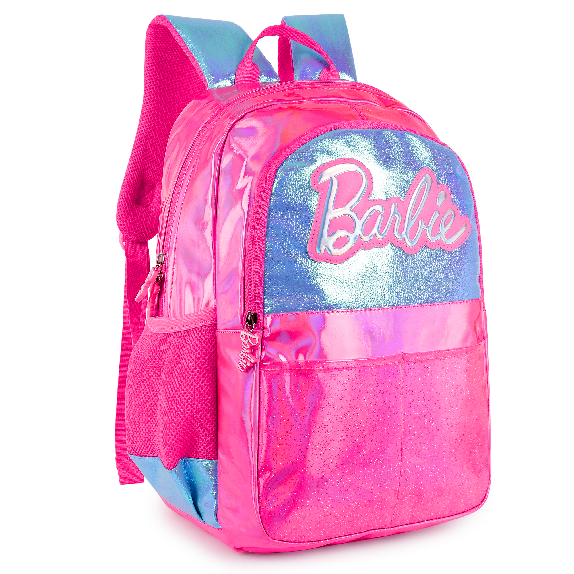 Let your little fashionista sparkle every day with the HOTSHOT Premium Barbie Backpack, a bold fusion of style and functionality. Featuring a stunning holographic pink and aqua blue finish with a 3D Barbie logo, this backpack radiates glamour and confidence. Whether it’s for school, travel, or fun outings, this backpack is designed to turn heads and inspire dreams.Crafted with high-quality, shimmering materials and loaded with practical features, it’s the ideal companion for young Barbie fans who love to shine while staying organized.