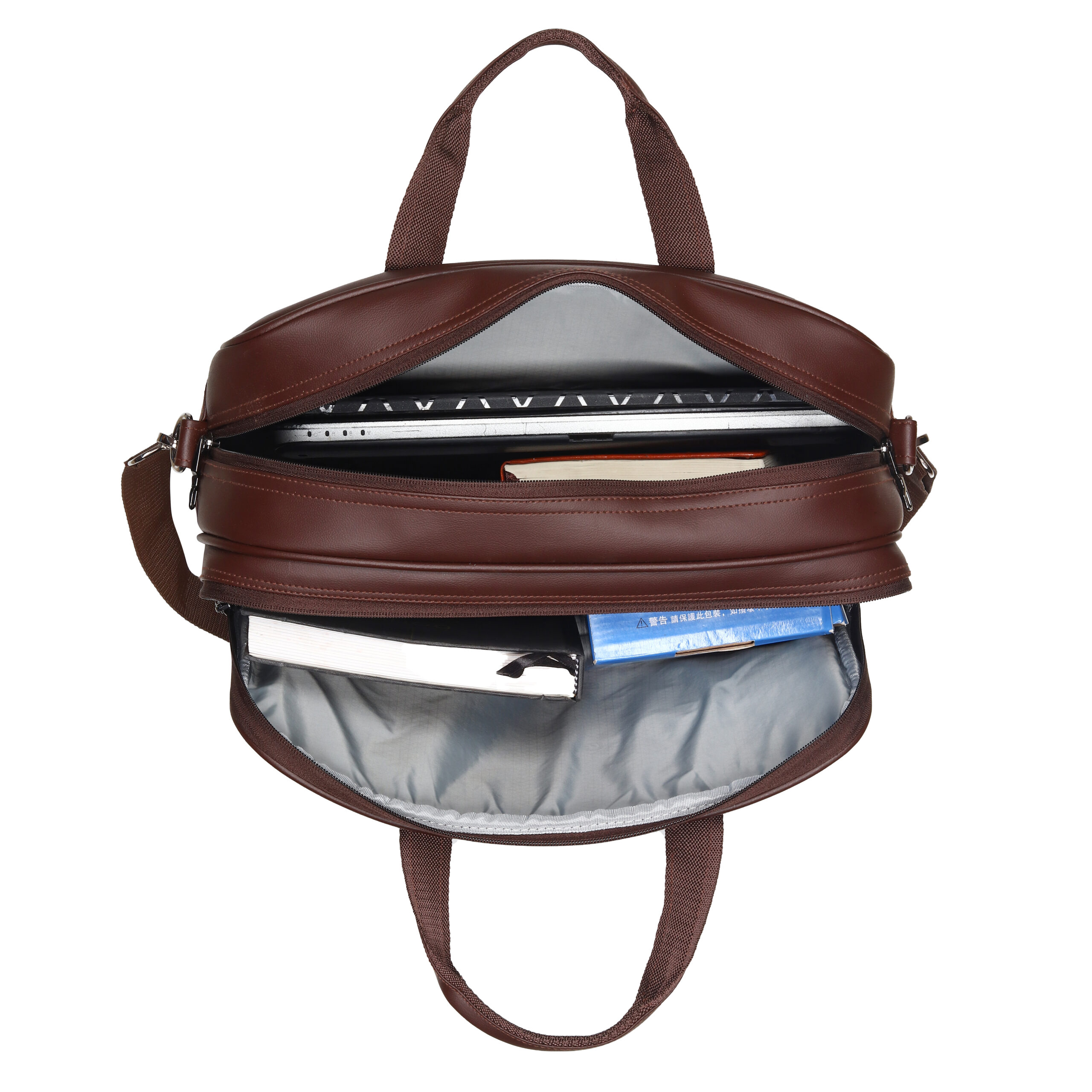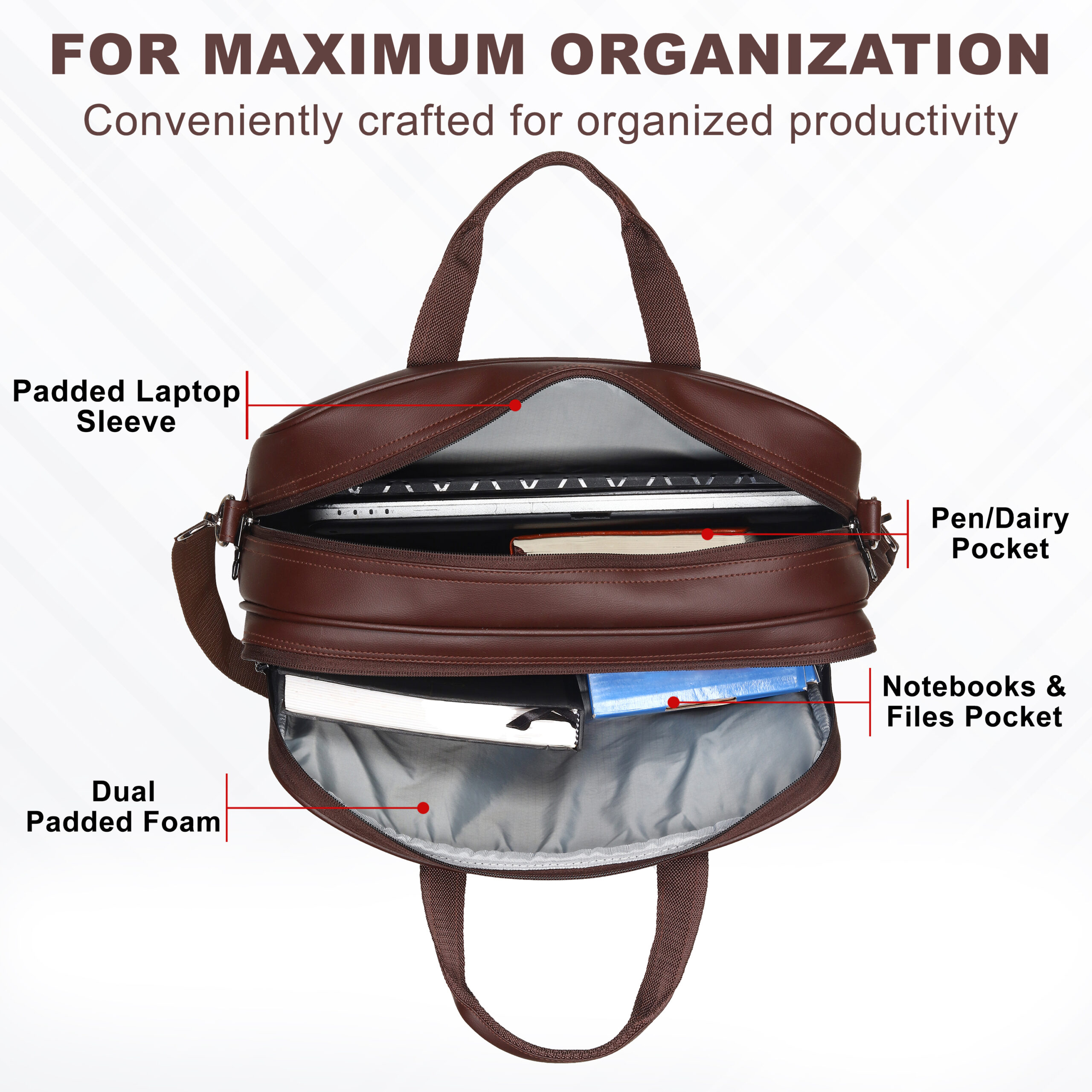 - Compartments & Pockets: 2 Main compartments for maximum storage, 3 Multi-utility pockets (Front & Back zipper pockets),Dedicated pen pocket, phone pocket, and diary pocket,Padded laptop compartment for secure device storage