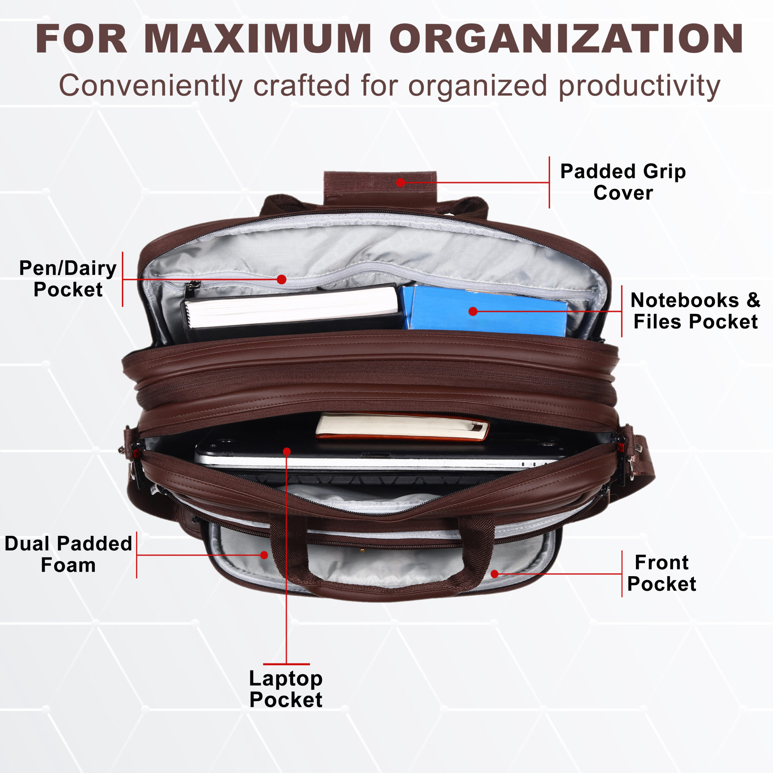 - Smart Organizer Section ,Includes pen pocket, phone pocket, and diary pocket to keep your accessories neatly arranged and easily accessible.
